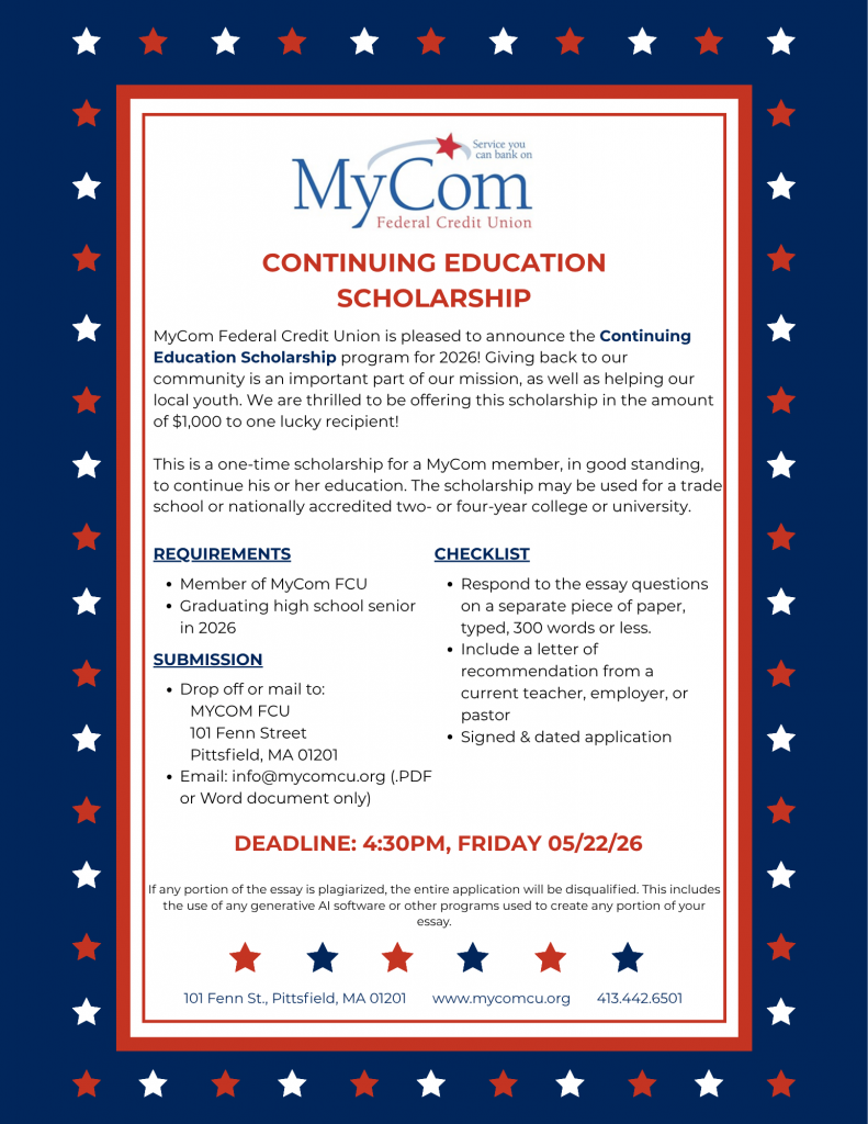 Submit completed applications in person at 101 Fenn Street, Pittsfield, MA or by email (info@mycomcu.org) (PDF or Word document only) before Friday, May 22, 2026!