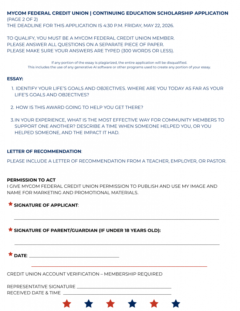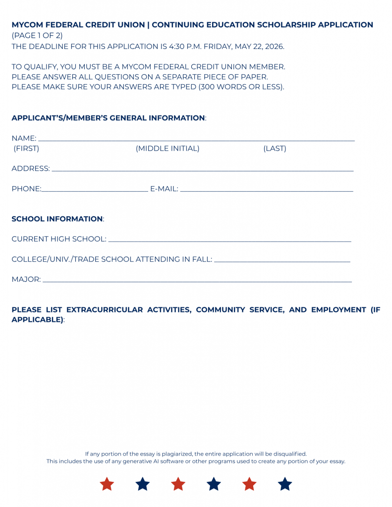 MyCom Federal Credit Union is pleased to announce the Continuing Education Scholarship program for 2026! Please feel free to print the application below.
